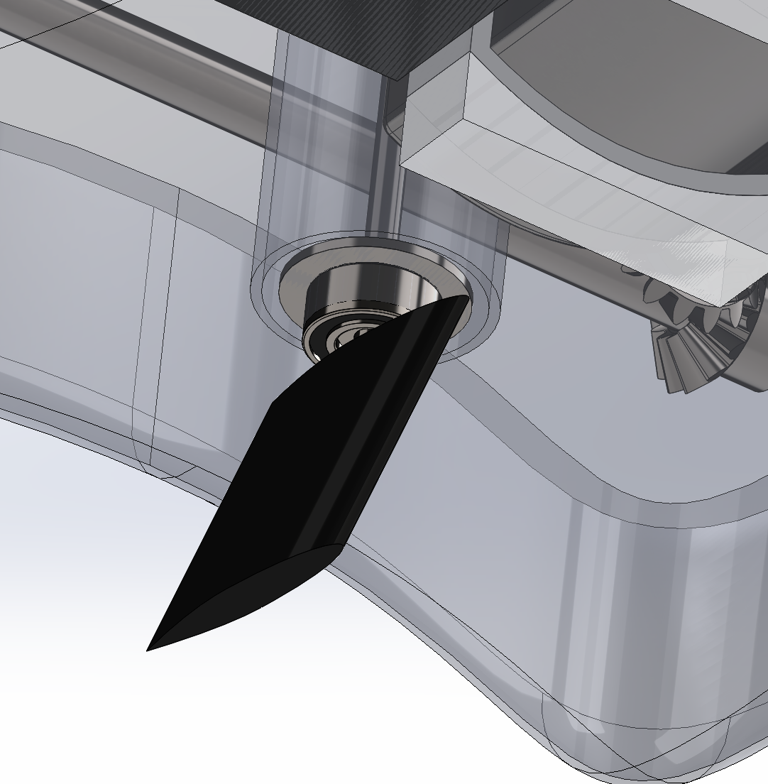 Sealing the rudder shaft was a much simpler process as the movement is restricted to just a rotation about the shaft axis. A sealed bearing was fixed in the bottom of the casing and cylindrical reservoir was created around it. The purpose of this reservoir is to prevent possible leakage from flowing throughout the rest of the hull whereby the electronic components lie. The top of the reservoir also houses a bearing that supports the rudder shaft.