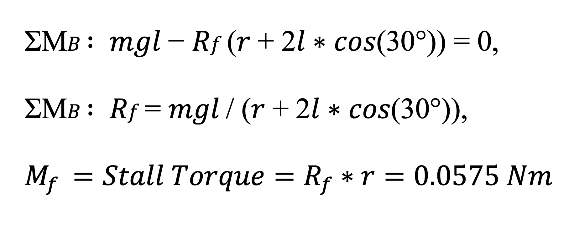 The first step to selecting a motor is to identify the required power - a function of both torque and rpm. A free body diagram was used to find the reaction force Rf in a worst case scenario. Subsequently the moment Mf was able to be identified as the stall torque. A healthy safety factor used to avoid the motor from stalling.